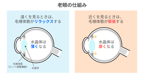 老眼の原因は、簡単にいうと、レンズの役割を果たしている「水晶体」の弾力が加齢によって失われてしまうこと。水晶体は、「毛様体筋」という筋肉が収縮することでその厚さを変えます。遠くを見るときは水晶体が薄く、近くを見るときは厚くなるのです。