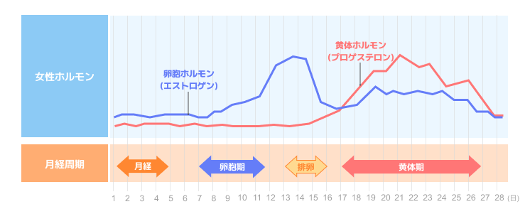 PMSの原因は未だ明らかになっていませんが、排卵に伴う女性ホルモンの分泌量の変動が影響しているというのが通説です。女性ホルモンにはエストロゲンとプロゲステロンの2種類があり、この両方の分泌量が黄体期(排卵後〜月経まで)の後半に急激に下がります。これによって脳内のホルモンや神経伝達物質の働きが妨げられ、PMSの症状につながるといわれています。