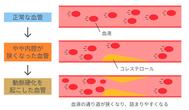 高コレステロール血症や低HDLコレステロール血症になると、コレステロールが血管の内壁に蓄積し(こぶのような形状になり、「プラーク」と呼ばれます)、血管は次第に厚く硬くなっていきます。これが、みなさんもよく耳にするであろう「動脈硬化」です。