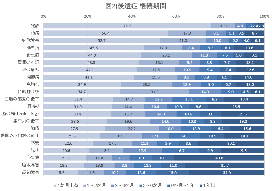 上の表(図2)は、後遺症経験があると回答した方に、その症状がどのくらい続いたかを回答していただいたものです。