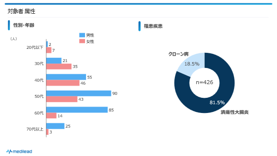 今回の調査におけるIBD患者さん426名の属性は以下の通りです。