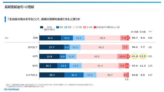 治療の結果としての「長期寛解達成」への理解度を見てみます。