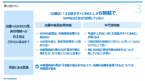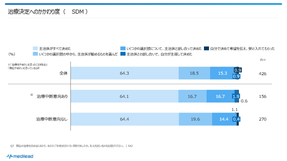 日本での現状はまだ「医師主体ではなく、患者が医師と一緒に決めていい」「患者も自主性を持ち治療に取り組むことが重要」であることへの理解が進んでいるとは言えず、治療継続モチベーションに影響するまでには至っていないようです。