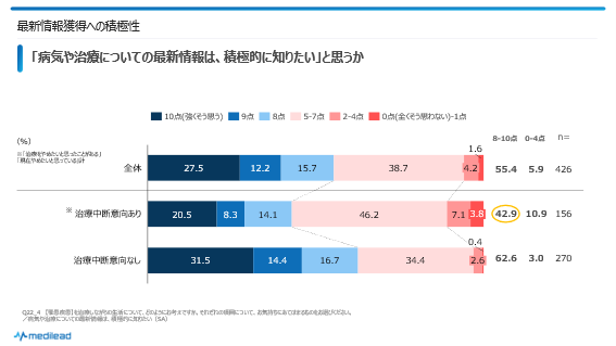 - 治療や薬剤の情報についての理解が深く、情報獲得への積極性も高い方が、中断意向は低い