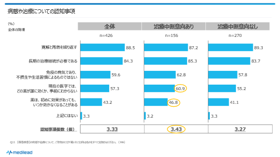 特に、「免疫の病気であり、不摂生や生活習慣によるものではない」「現在の医学では、どの薬が誰に効くか、事前にわからない」「薬は、初めに効果があっても、いつか効かなくなることがある」においては、中断意向あり者ではなし者と比べ5%以上高くなっています。