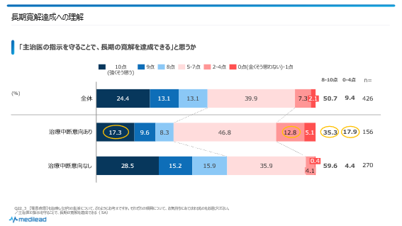 第一回でも触れましたが、治療継続モチベーションの低い人(中断意向あり者)はなし者よりも、「主治医の指示を守ることで、長期の寛解を達成できると思う」度合いが低いのです。