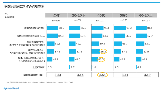 病態や治療についての認知事項、および認知している数は年代別でどのような違いがあるのでしょうか。