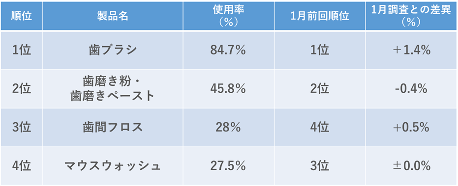 「あなたが普段使用しているオーラルケア・デンタルケア製品を教えてください」と質問したところ、「歯ブラシ」が1位、「歯磨き粉」は2位という結果になりました。3位は「歯間フロス」がランクインし、1月度の調査より+0.5%上昇しました。