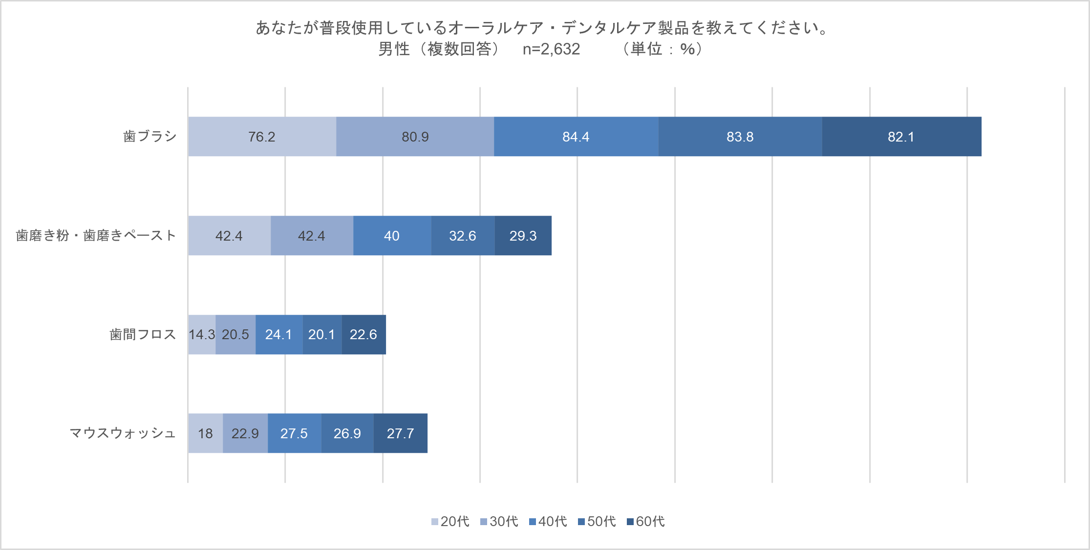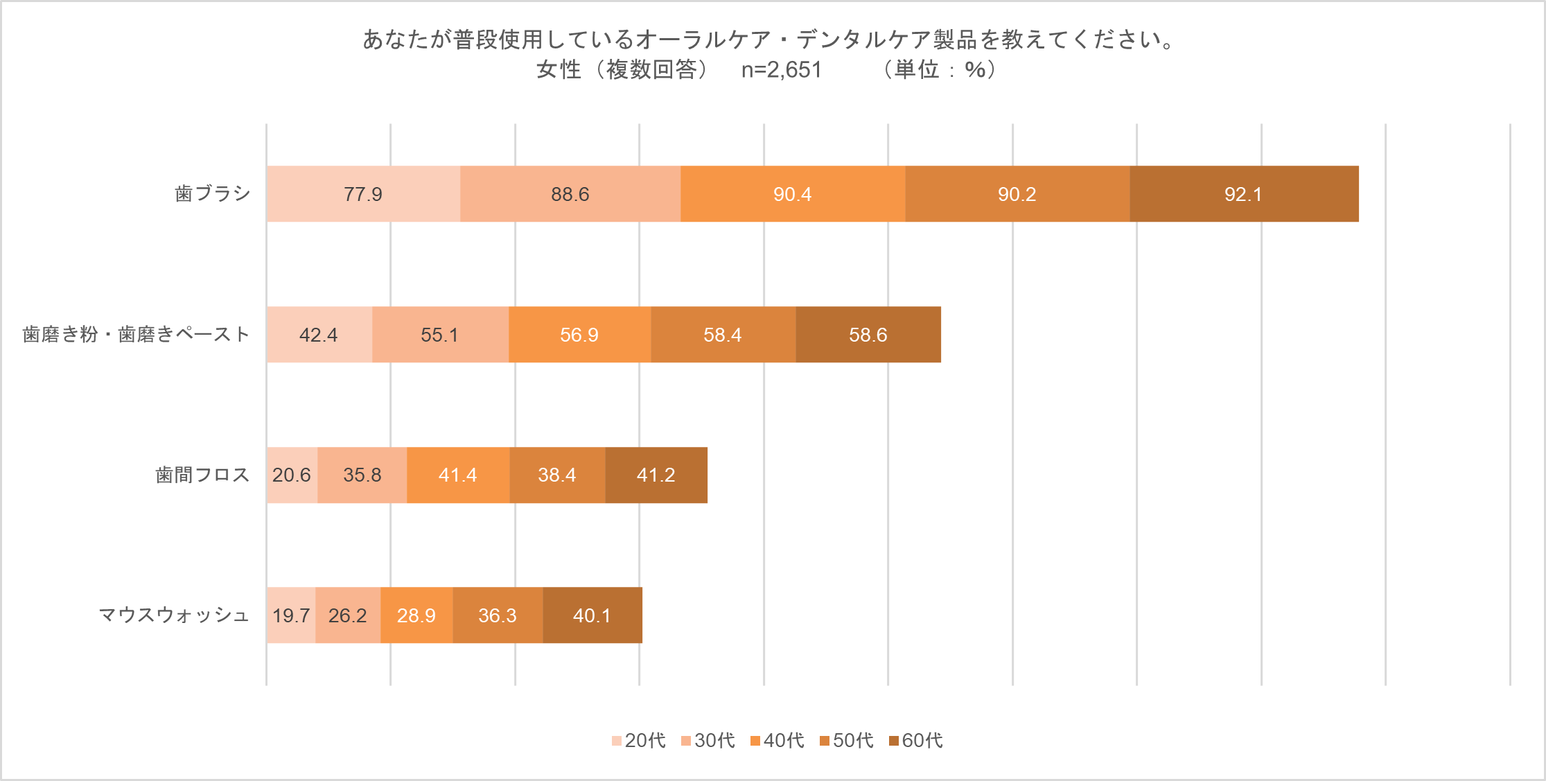 使用率第3位の「歯間フロス」は男性よりも女性の使用率が高い一方で、男性は「歯間フロス」よりも「マウスウォッシュ」の使用率が高いことが明らかになりました。
