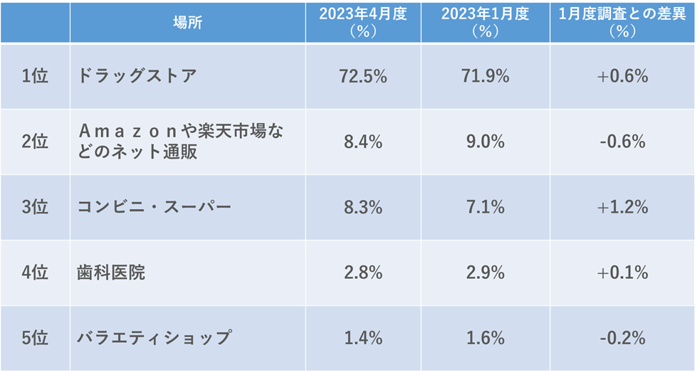 今年1月から4月までの3か月で使用率が上がった「歯間フロス」の購入場所は、実店舗での購入の割合が増えており、新型コロナウイルス規制緩和の影響が出始めていると推測されます。