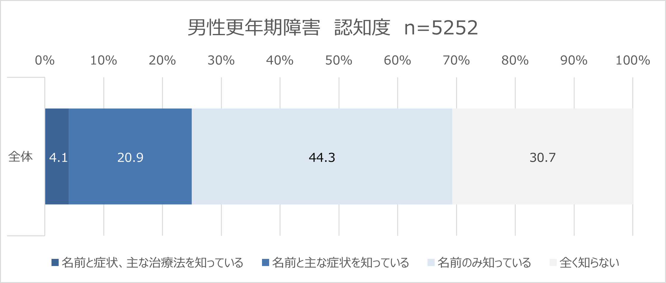 男性更年期障害の認知状況は、25%が名前と治療法・症状までを認知<図1> (「名前と症状、主な治療法を知っている」4.1%、「名前と主な症状を知っている」20.9%、「名前のみ知っている」44.3%、「全く知らない」30.7%)