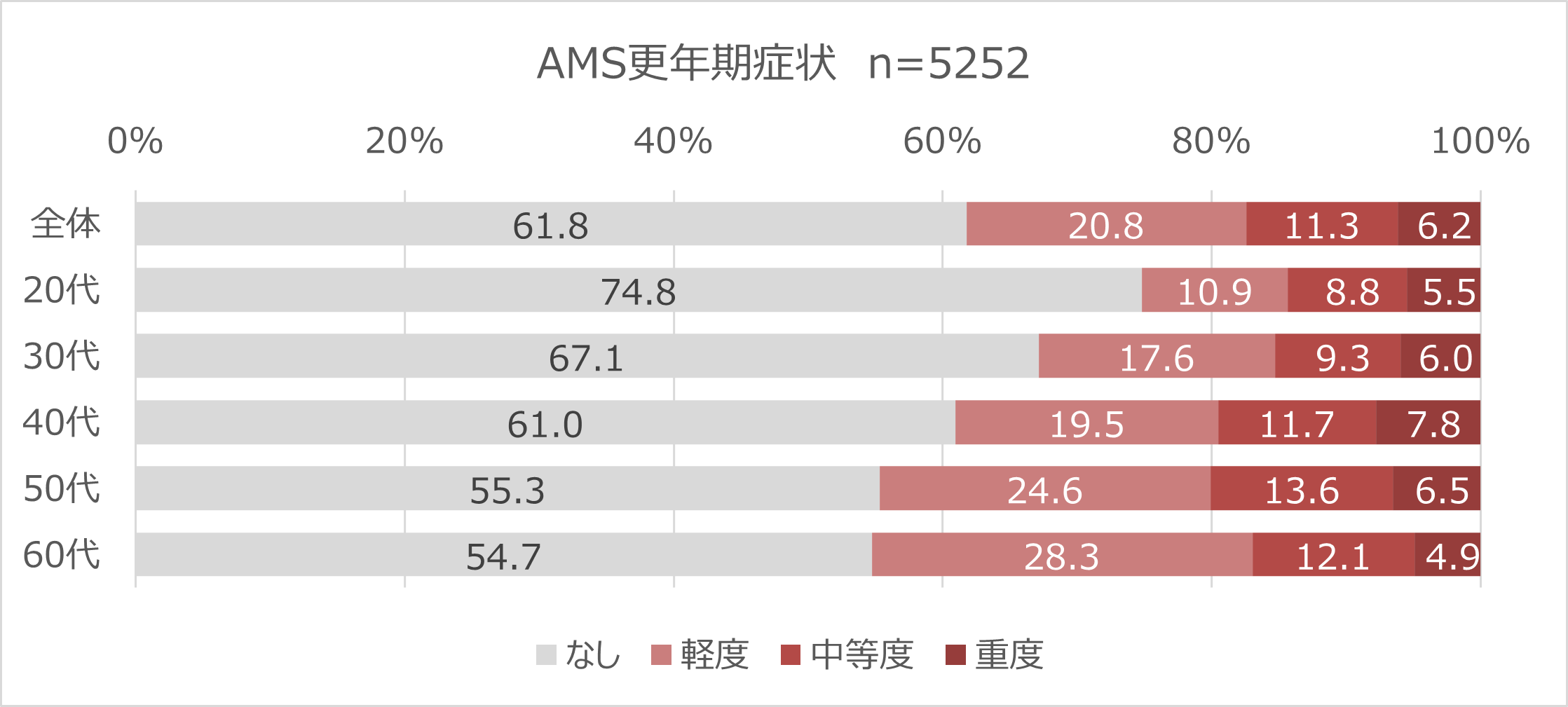 AMSスコアは精神・心理症状(5問)、身体症状(7問)、性機能関連症状(5問)の17問で構成されており、各項目とも「なし」、「軽い」、「中等度」、「重い」、「非常に重い」の5段階で評価し、それぞれ1~5点の点数をつける。合計85点のうち、26点以下が正常、27~36点が軽度、37~49点が中等度、50点以上が重度と分類される。(※1)