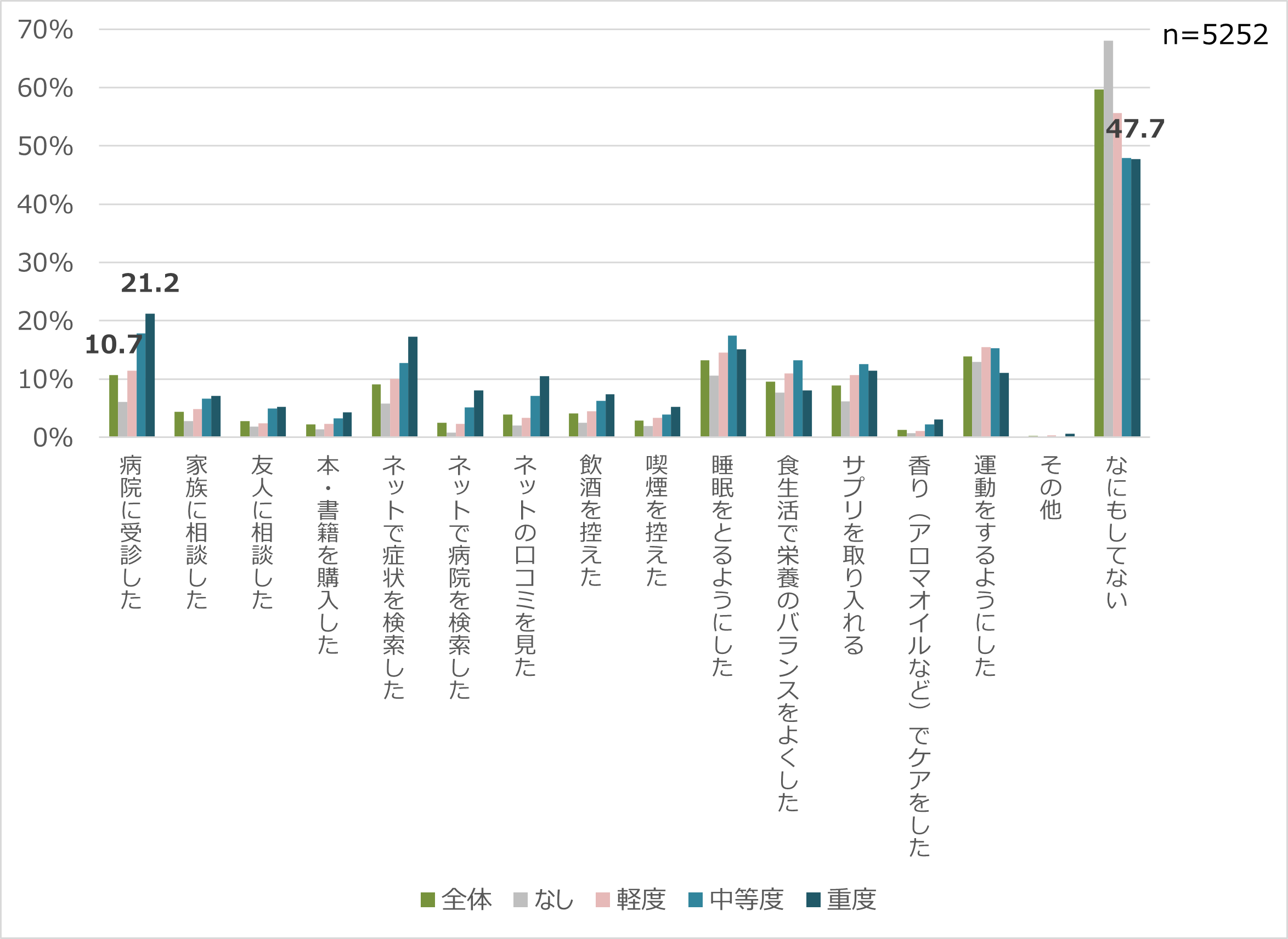 なんらか症状のある人の中で病院を受診したのは全体ではわずか10.7%、AMS判定で「重度」の方でも20%程度しか受診してない<図3>