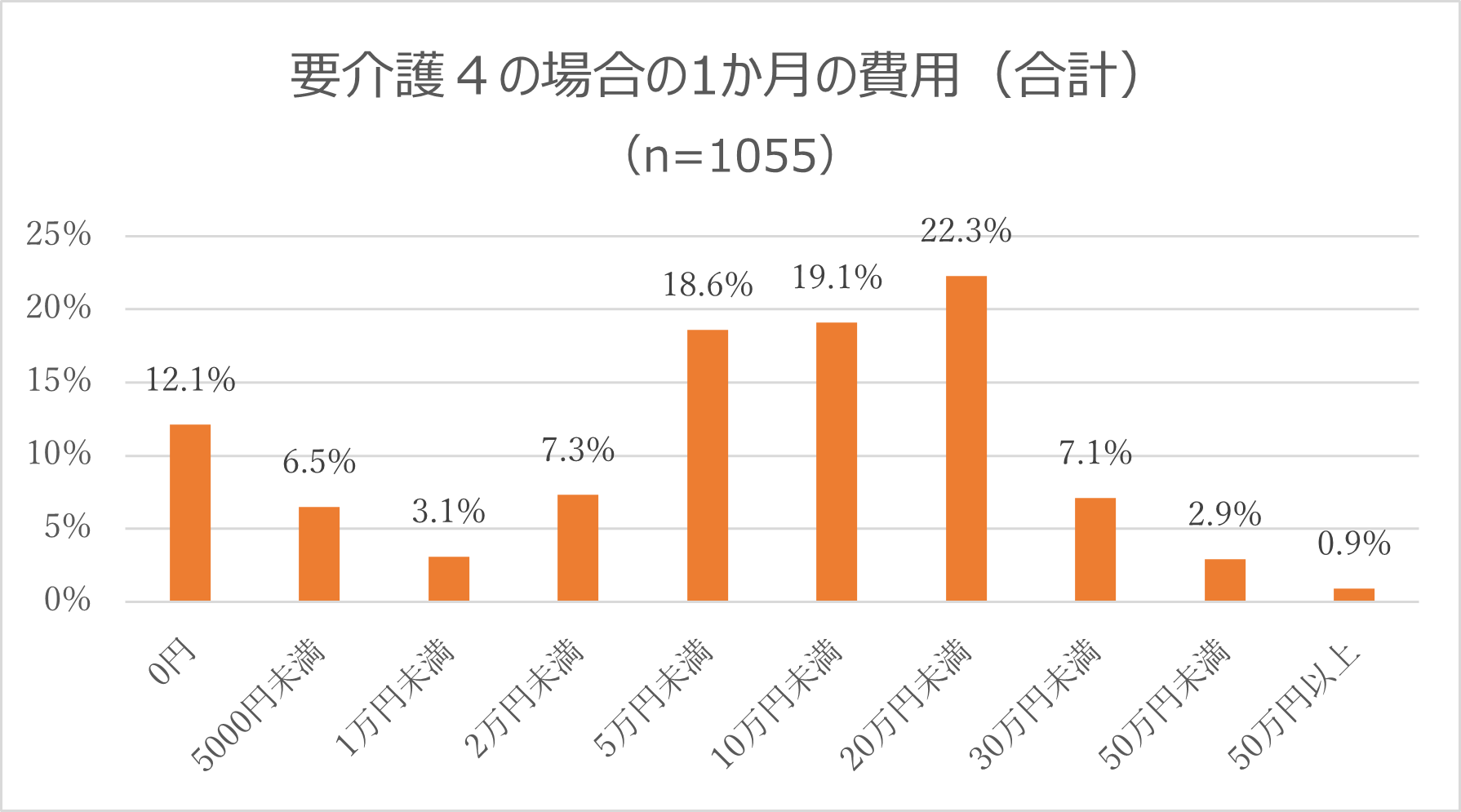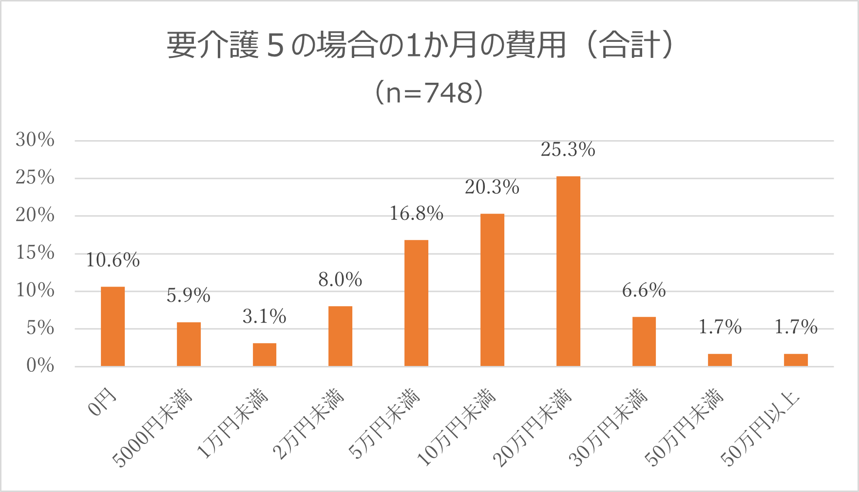 要介護1までは、5万円未満までがほとんどを占めています。要介護2、3では、10万円以上かかる方も約3割いらっしゃいました。要介護4,5では、10万円~20万円未満の割合が最も多く、それぞれ22.3%、25.3%でした。要介護度が上がっていくにつれ、費用も高くなることがわかります。