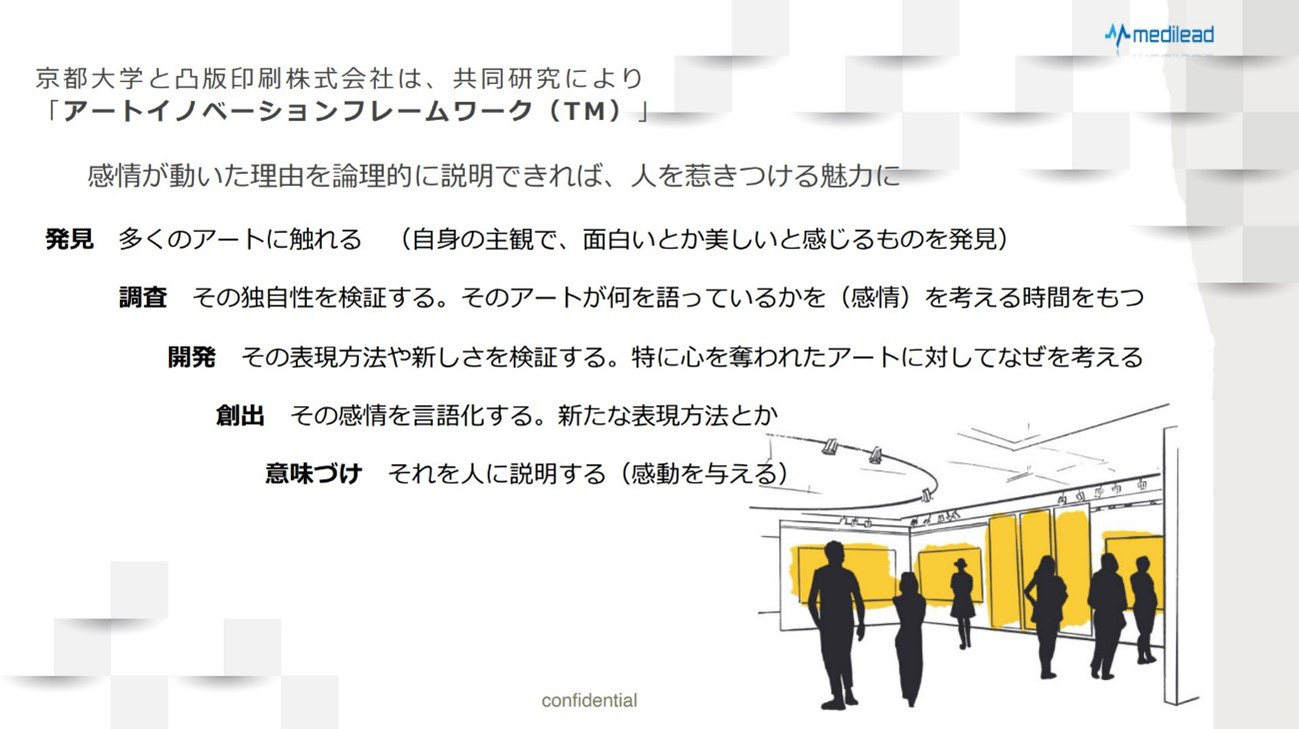 そして、なぜ自分がそのアートに取りつかれたのかということを自分自身で考えて、その感情を言語化していきます。芸術家や画家の場合は、それを絵にしますが、我々の場合は、言葉として表現するのです。その言葉として表現したものを、人に説明するということが大事なポイントです。これを1人で持っていても何も役に立たないのですが、自分で言語化したものを人に説明することで、人に感動を与えるということが一つのアート思考となります。これは、プレゼンテーションを行うことや、調査結果をクライアントにレポートすることも、言語化したものを説明するという点で共通しています。