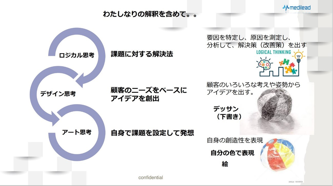 顧客のニーズをベースにアイディアを創出し、そのアイディアに独自性、創造性をつけて表現していく。この、デザイン思考とアート思考の組み合わせは、仕事にも活かせる考え方だと思います。