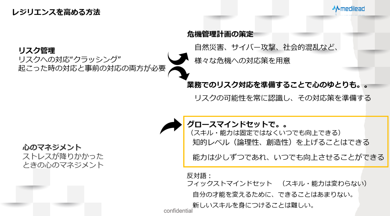 日々の業務はもちろん、生活においてもグロースマインドセットをもつことが、心のマネジメントにおいてはとても大切なのです。