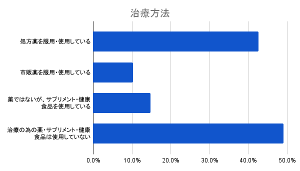 当社が保有する疾患情報パネルであるMHPによると、摂食障害で入院・通院された方108人のうち、処方薬を服用・使用している方は約43%でした。半数以上は薬物を用いずに、認知行動療法などが中心であることが伺えます。
