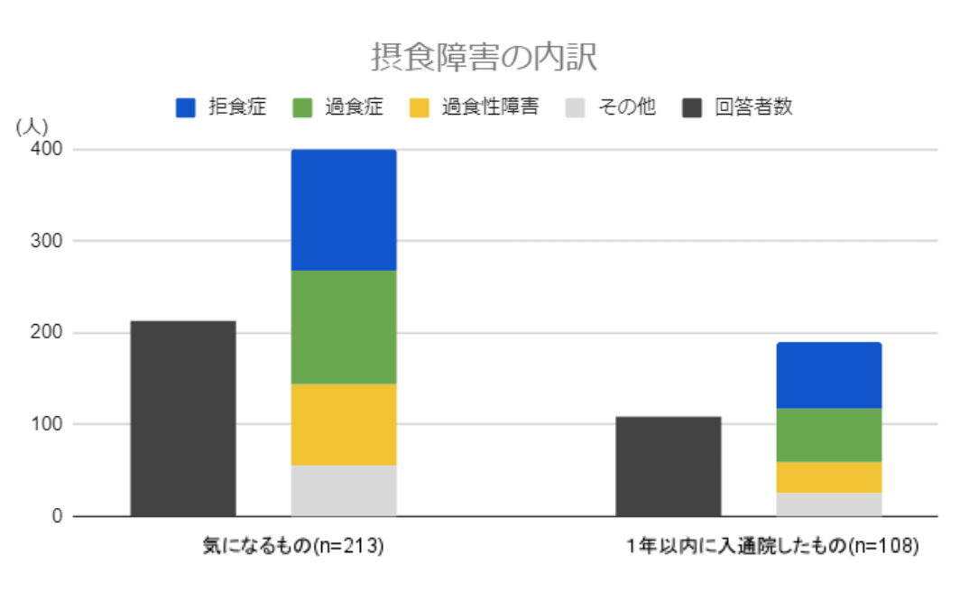 MHPでは、気になる症状、1年以内に入通院した症状を聞いています。それによると、摂食障害と回答した人のうち、拒食症・過食症・過食性障害のそれぞれの内訳は、上図の通りとなりました。どちらも拒食症が一番多く、過食症、過食性障害と続いています。また、該当数に対し回答数は約2倍となっており、多くの方が、拒食症と過食症など2つ以上の疾患を併発していることも伺えます。