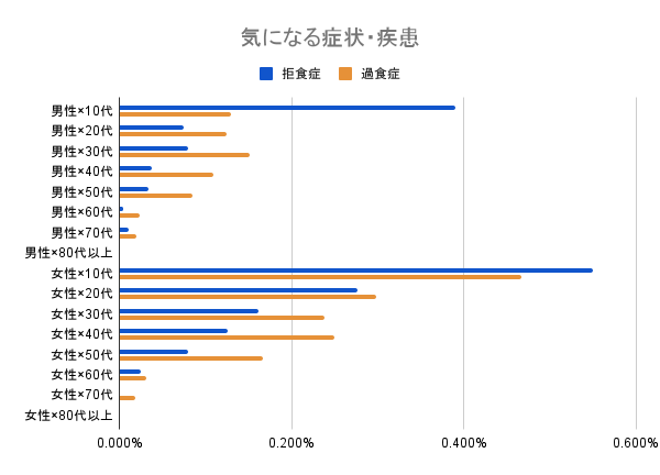 男性については、10代の拒食症発症率が0.39%と最も高かったものの、それ以外の年代での拒食症発症率は0.1%未満でした。しかし、過食症については10代から50代まででそれぞれ0.1%台となっており、拒食症よりも発症率が高いことが伺えました。