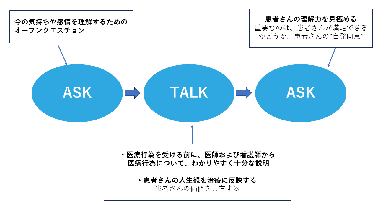 最後の「ASK」が一番大切で、患者さんの理解力を見極めて、理解したかを確認することです。『今までお話しした中で一番記憶に残っていることを話してみてもらえますか』という質問をすることで、患者さんの理解度などを知ることができることがあります。