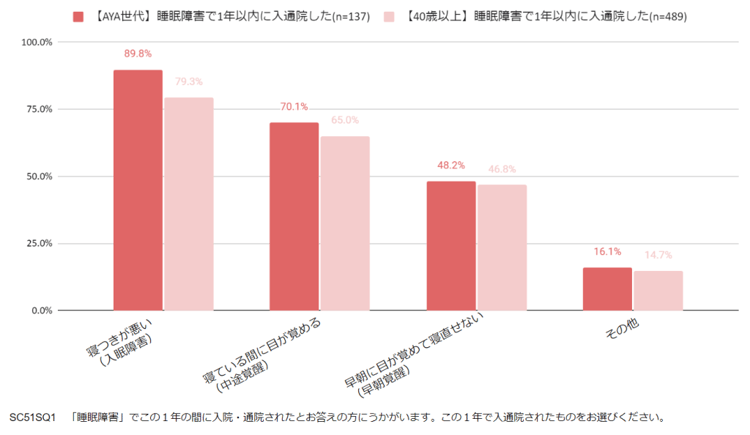 | ・ | 睡眠障害で入通院したAYA世代のうちの約89.8%が、寝つきが悪い(入眠障害)であった〈図5〉 |