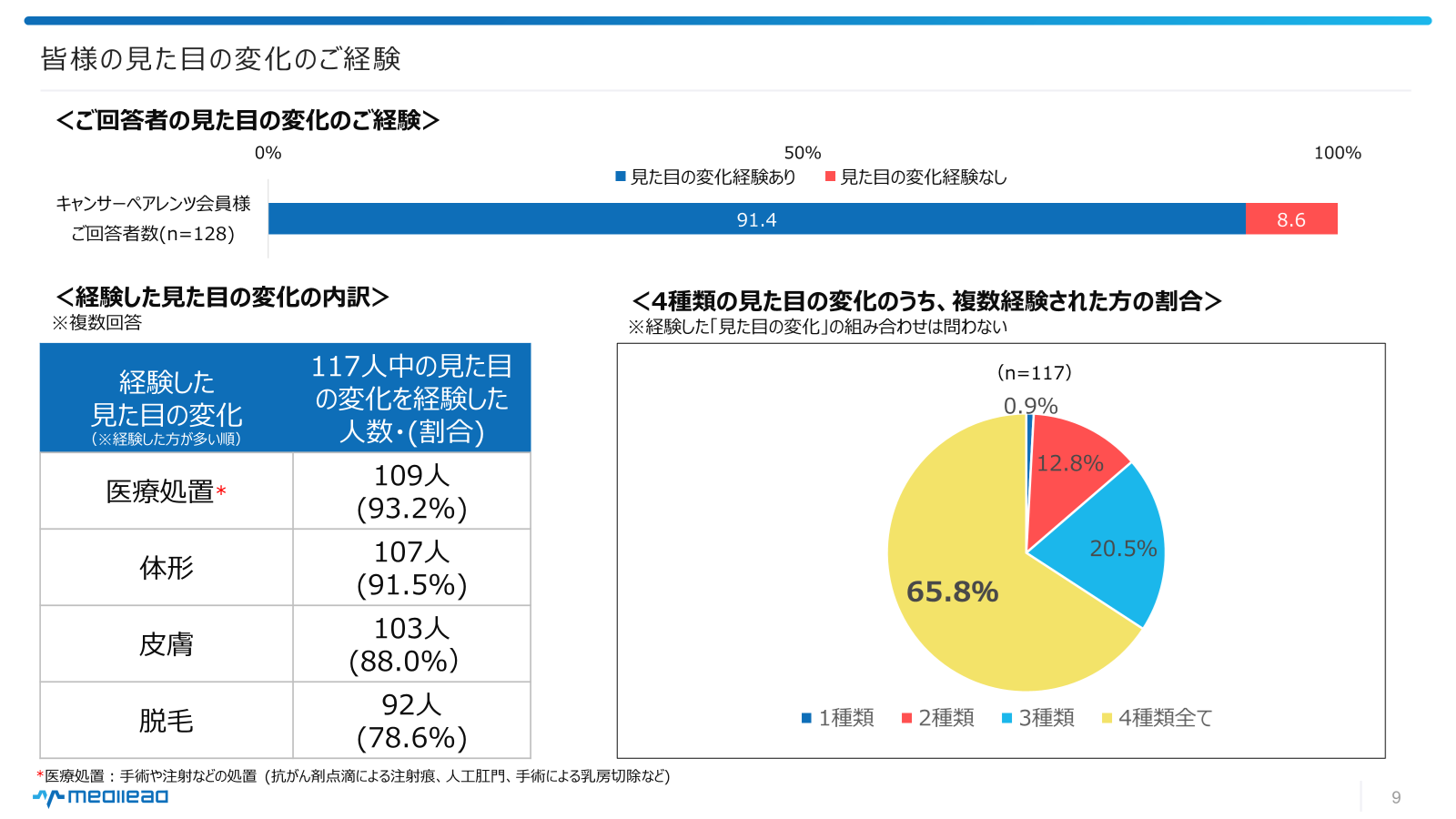 最も割合が高かったのが手術や注射などの医療処置による変化(93.2%)で、体形(91.5%)、皮膚(88.0%)、脱毛(78.6%)と続きます。また、見た目の変化を経験している方は、ほぼすべての方が、1種類ではなく2種類以上経験されていることがわかりました。最も多いのが4種類すべてを経験されている方で、65.8%という結果となりました。