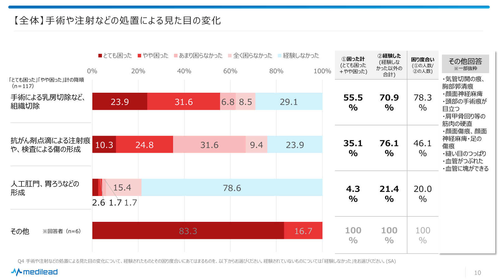 手術や注射などの医療処置による変化としては、具体的には、注射痕や傷の形成、手術による乳房切除などを含みます。「手術による乳房切除など、組織切除」により「とても困った」「やや困った」と回答した方は55.5%で、経験した方の中では78.3%の方が「とても困った」「やや困った」と回答しました。
