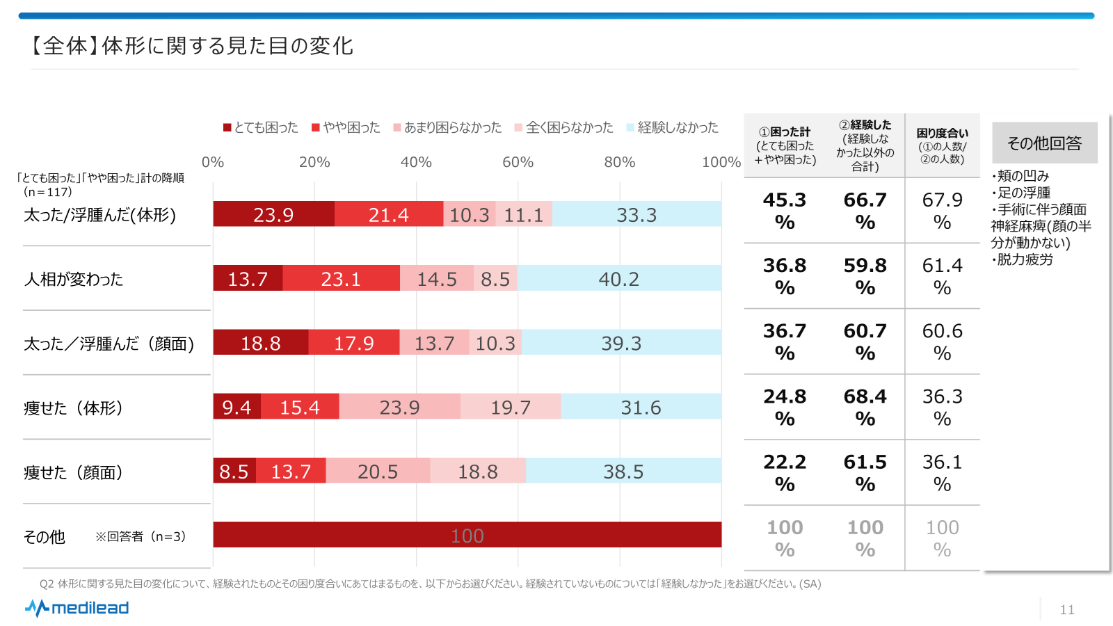 これらの変化に対する患者さんの困り度や精神的な苦痛は、医療提供者や支援者にとって重要な考慮事項です。治療の物理的な側面に加えて、患者さんの精神的な健康と生活の質を支えるための継続的、包括的なケアが必要であることを、改めて認識しました。