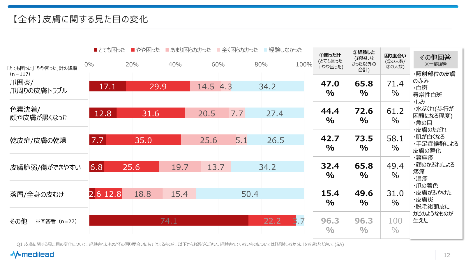 その他には27名から回答がありました。しみ、湿疹、蕁麻疹、皮膚炎など、様々な変化を経験しており、それぞれの困り度も高いことがうかがえました。