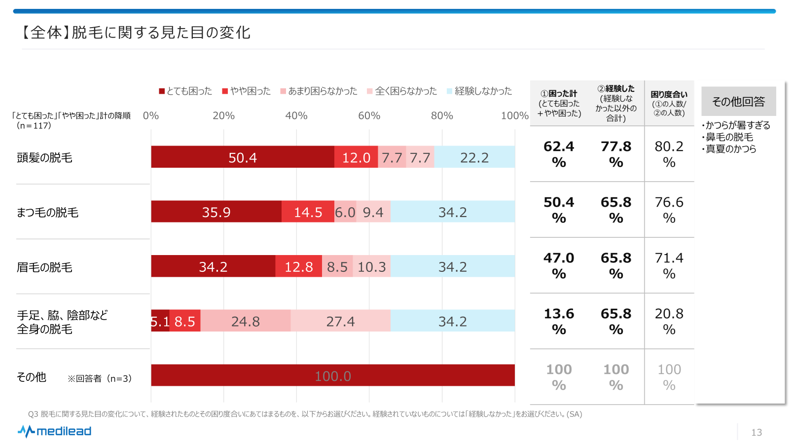 さらに、まつ毛の脱毛、眉毛の脱毛においても、それぞれ経験した方の7割以上が「とても困った」「やや困った」と回答していることから、顔周りの変化については特に困り度が高いことがうかがえます。