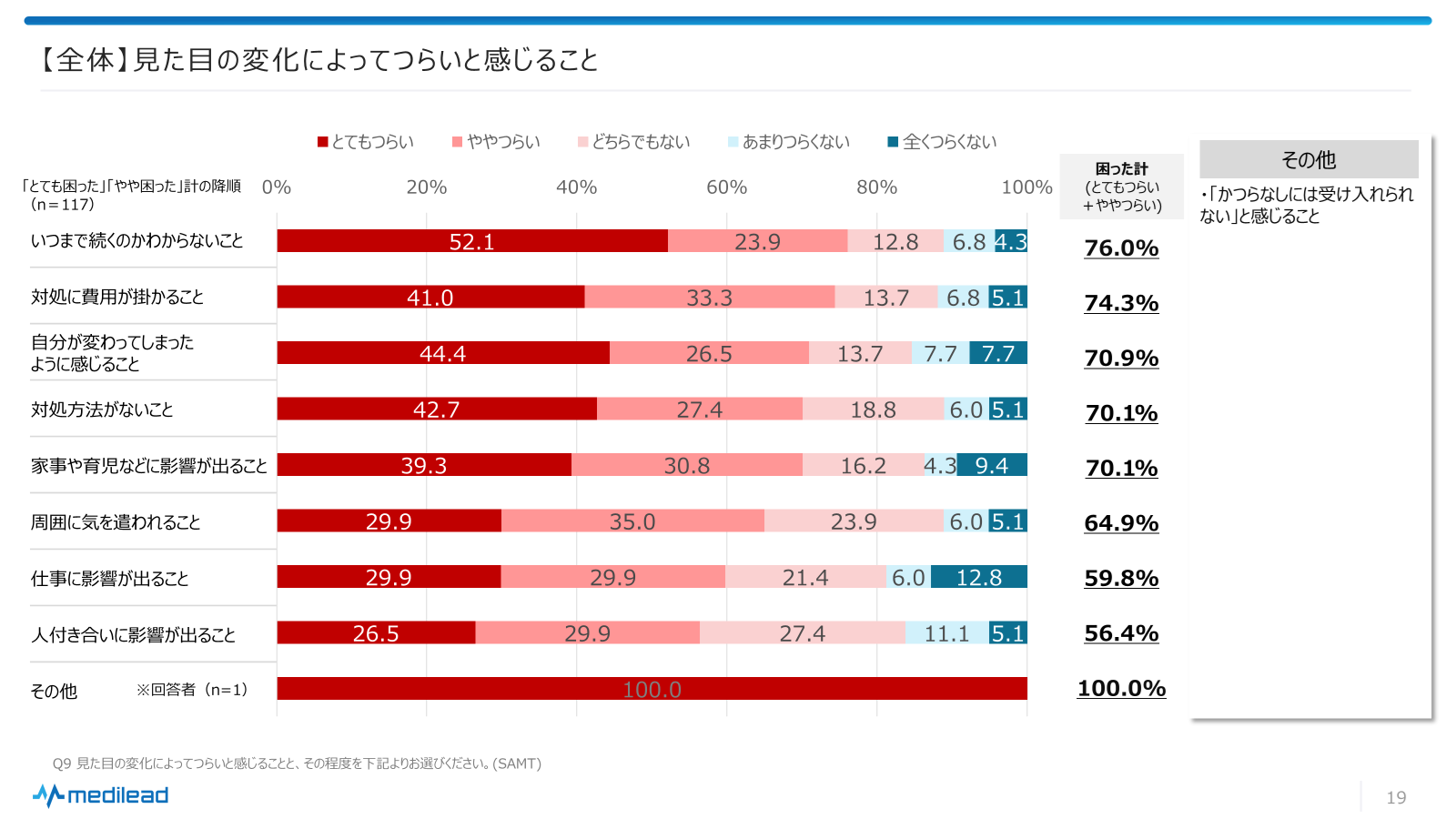 見た目の変化によってつらいと感じることをお聞きしたところ、上記の結果となりました。