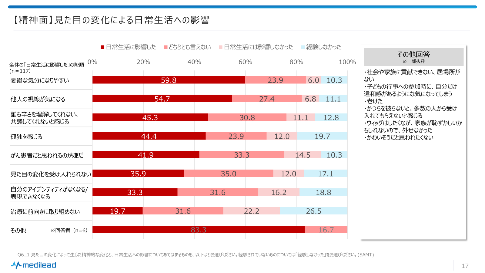 また、見た目の変化によって生じた精神的な変化と、日常生活への影響を聞いた結果が上記となります。「憂鬱な気分になりやすい」が最も高く、59.8%の方が日常生活に影響したと回答しています。「他人の視線が気になる」「誰も辛さを理解してくれない、共感してくれないと感じる」「孤独を感じる」と続きますが、見た目の変化により、周囲の視線が気になるということに加え、憂鬱な気分や孤独にまでつながっていることがうかがえます。