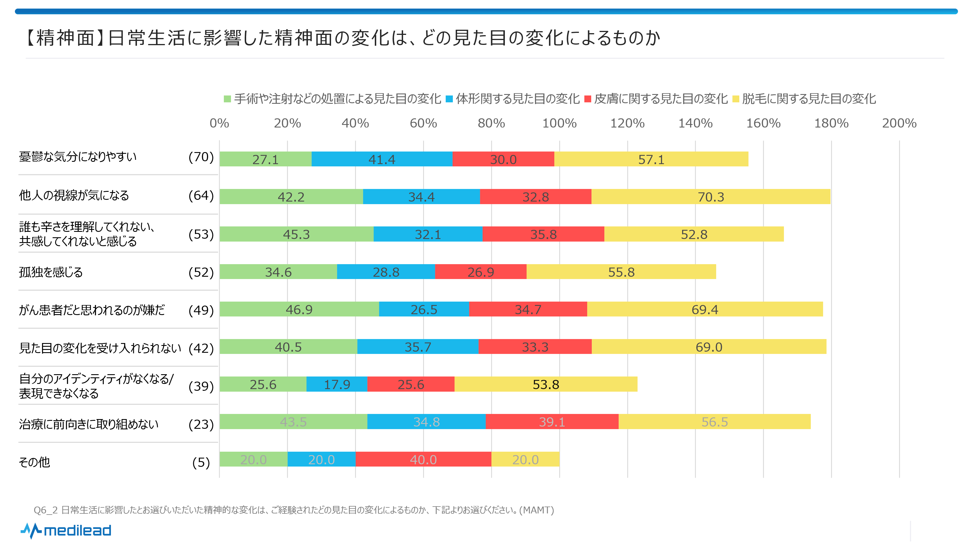 それぞれの精神的な変化は、どの見た目の変化によるものかを聞いた結果が上記となります。ほぼすべての精神的な変化において、「脱毛に関する見た目の変化」が影響していると回答した方が最も多いという結果となりました。特に、「他人の視線が気になる」「がん患者だと思われるのが嫌だ」「見た目の変化を受け入れられない」において、高い割合となっています。