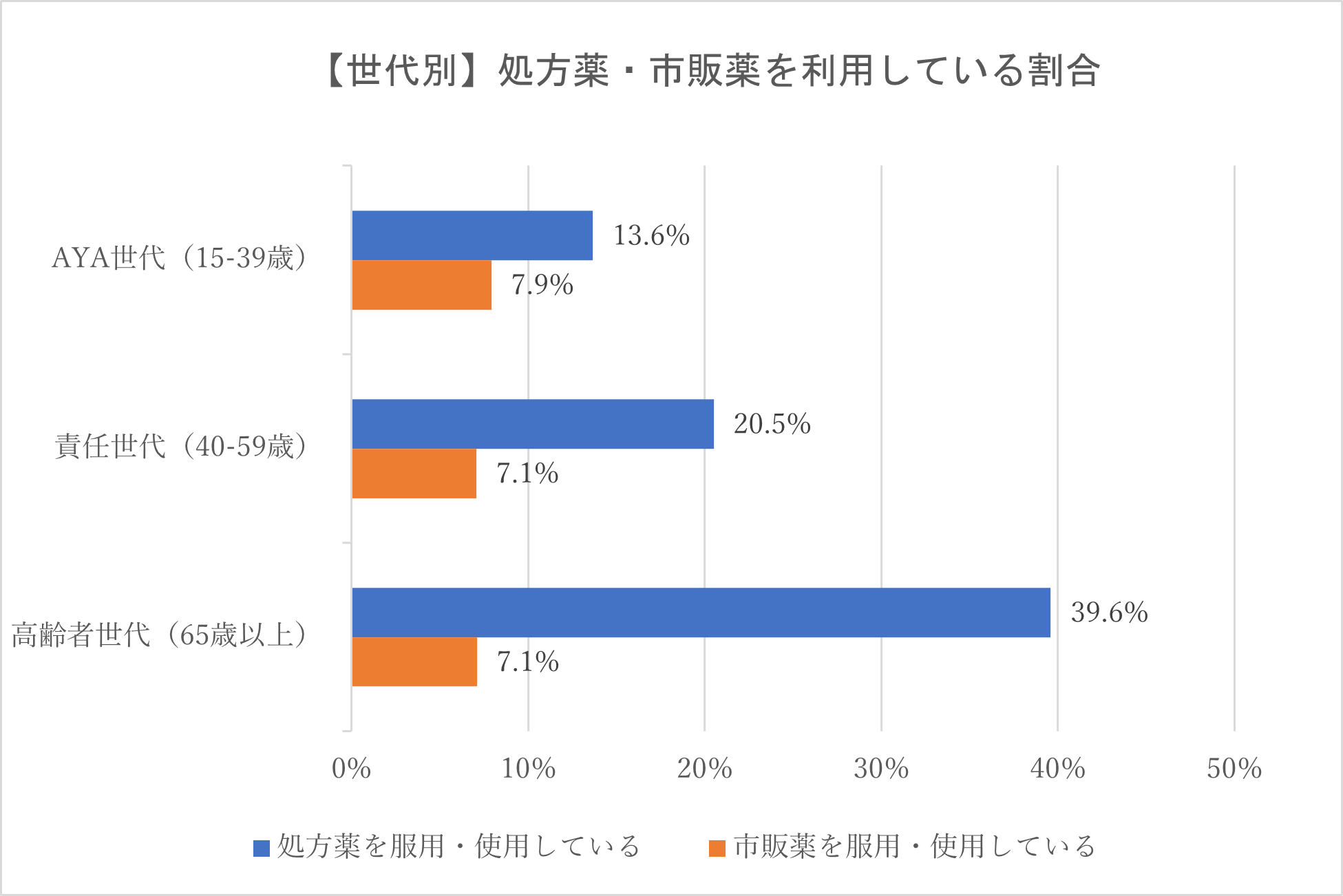 すべての年代において市販薬よりも処方薬の使用率のほうが高いことが示されています。処方薬の使用率は高齢者世代が最も高く、AYA世代は最も低くなっています。市販薬の使用率については、年代間で大きな差は見られません。AYA世代の市販薬と処方薬の使用率は比較的均衡していますが、市販薬の使用率については責任世代や高齢者世代よりもわずかに高い結果となっています。