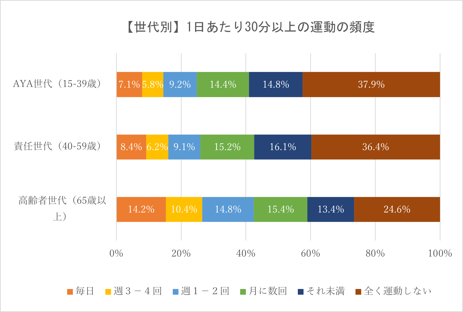 高齢者世代で運動の頻度が上がる傾向が見られますが、責任世代とAYA世代ではほとんど差は見られません。このことから、運動習慣については、AYA世代特有の傾向ではないと考えられます。