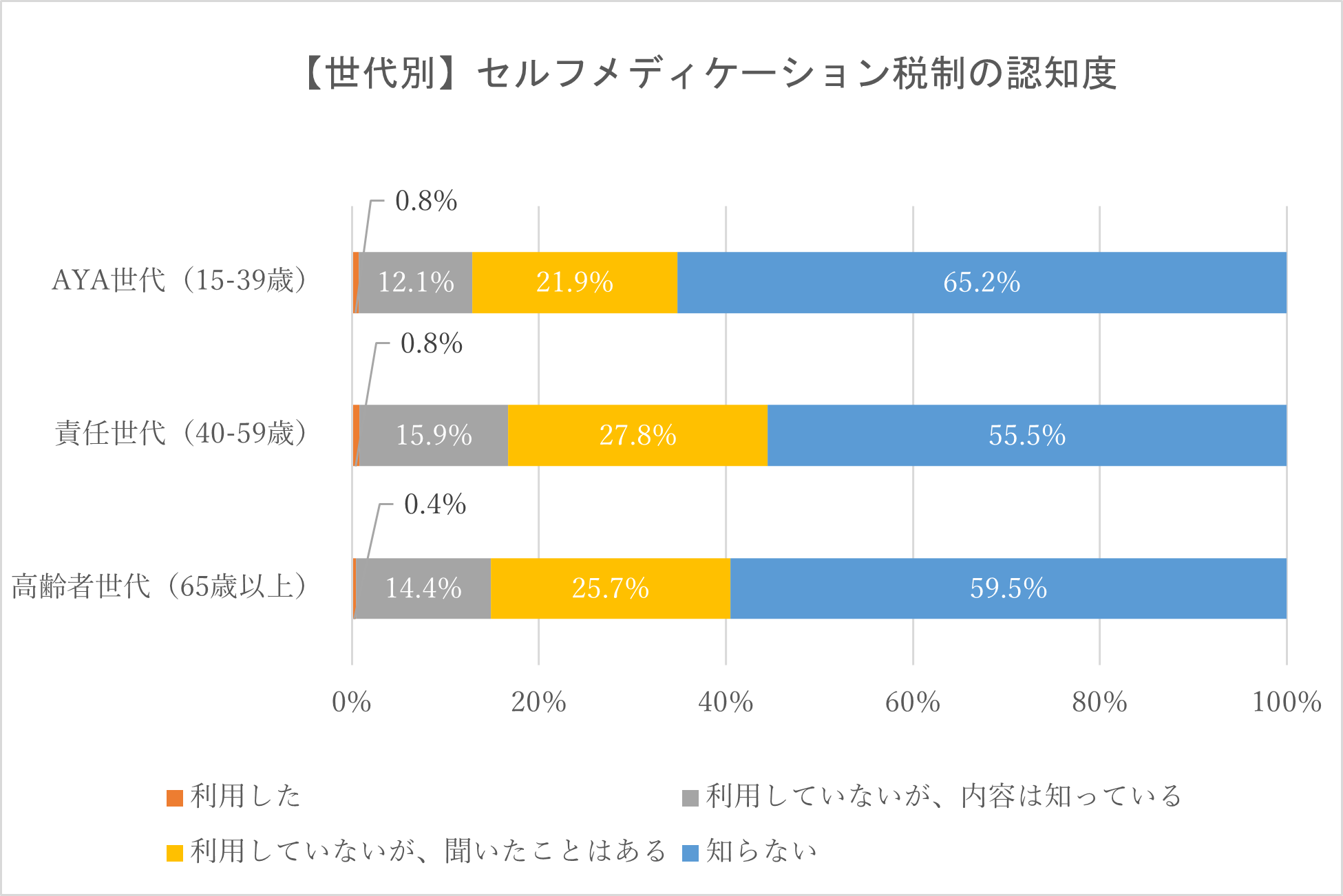 一方で、セルフメディケーション税制についてお聞きしたところ、AYA世代の認知度は他の世代に比べて低いという結果となりました。セルフメディケーション税制とは、個人が自己の判断で市販薬を購入し、自己治療(セルフメディケーション)を行った場合に、その費用を一定額まで税額控除することができる制度です。