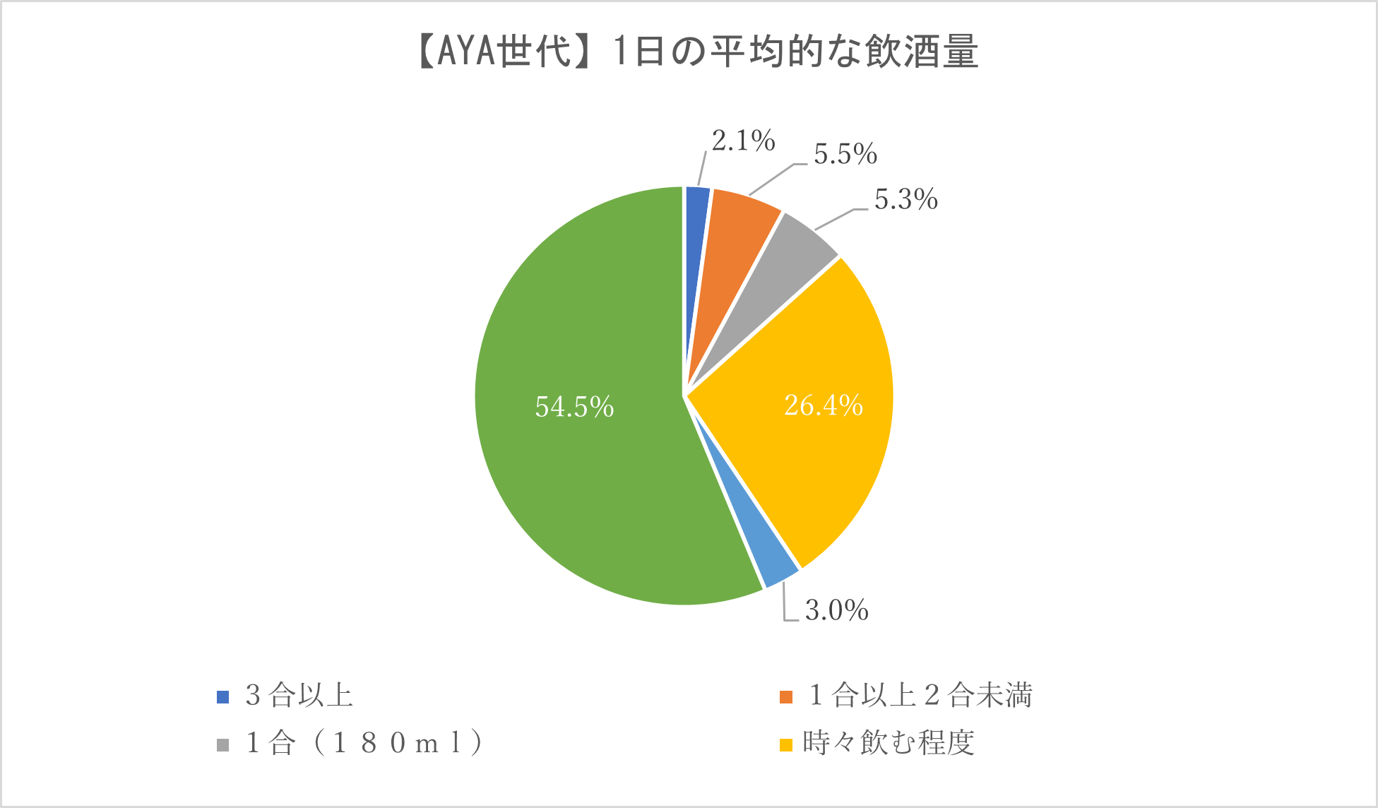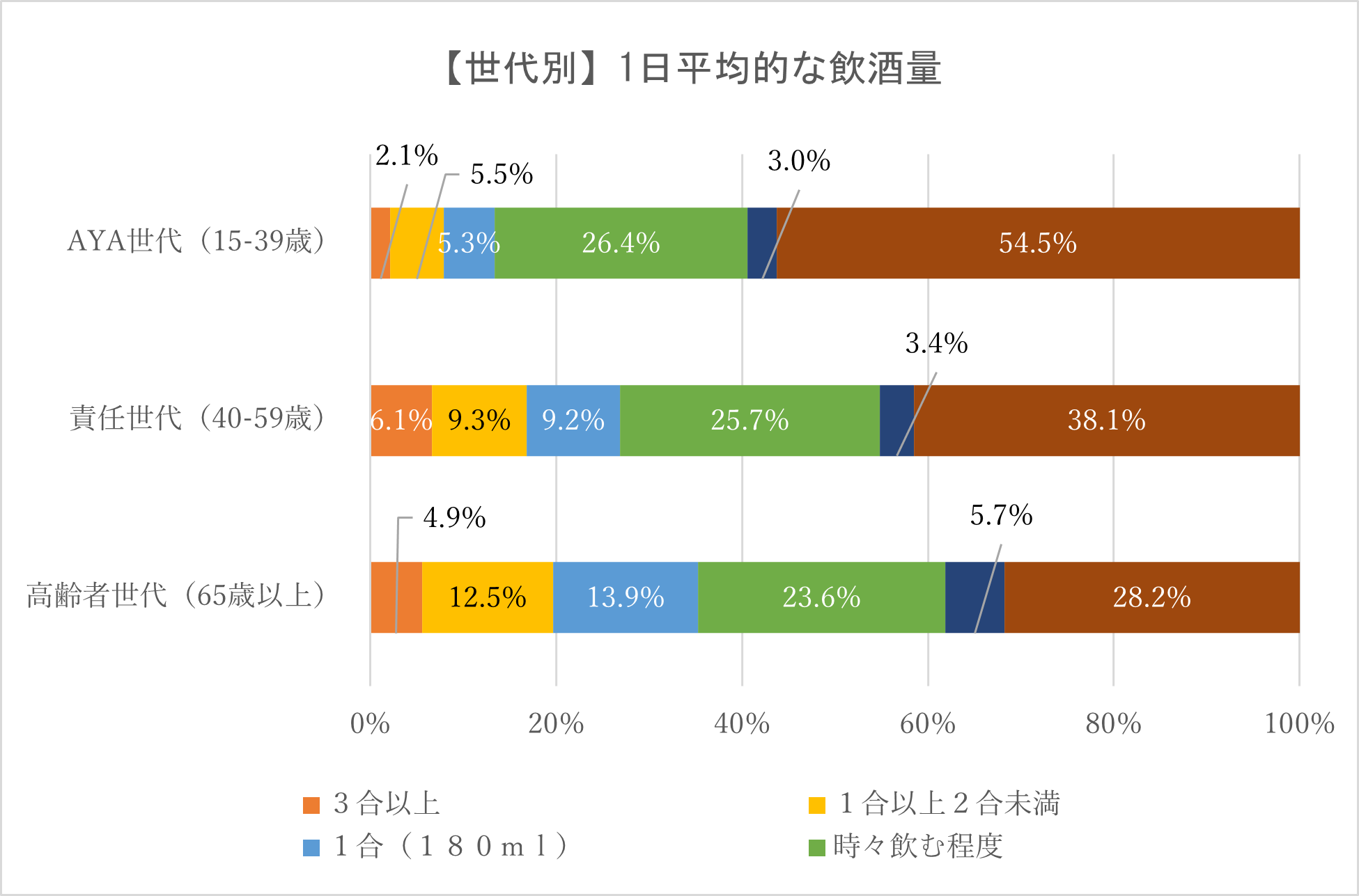 高齢者世代、責任世代ともに、「飲まない または飲めない」「やめた(過去飲酒)」と回答した方は、それぞれ40%前後にとどまっています。他の世代と比較すると、AYA世代の飲酒量が比較的少ないことが分かります。未成年者を含むことが一因ですが、飲酒量も比較的少なく、他の世代と比較して飲酒を控えている傾向が見られます。