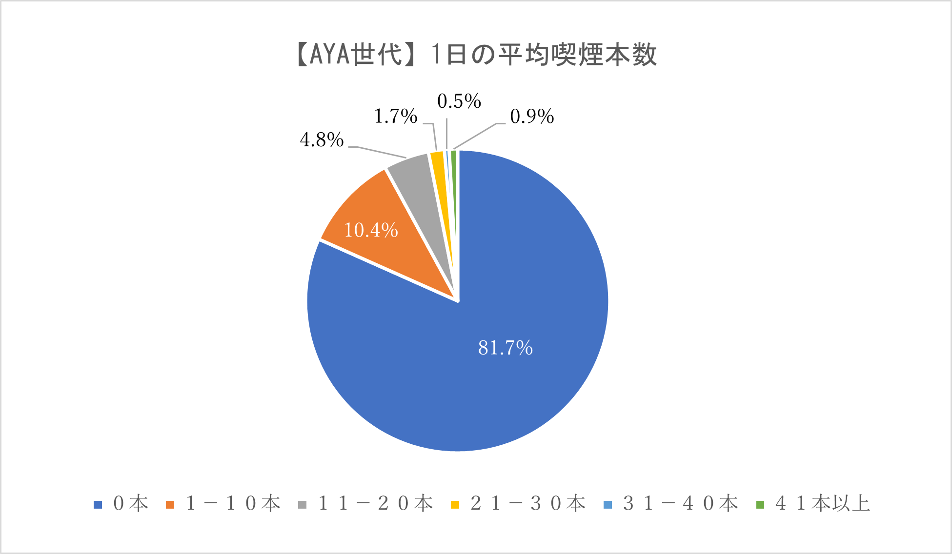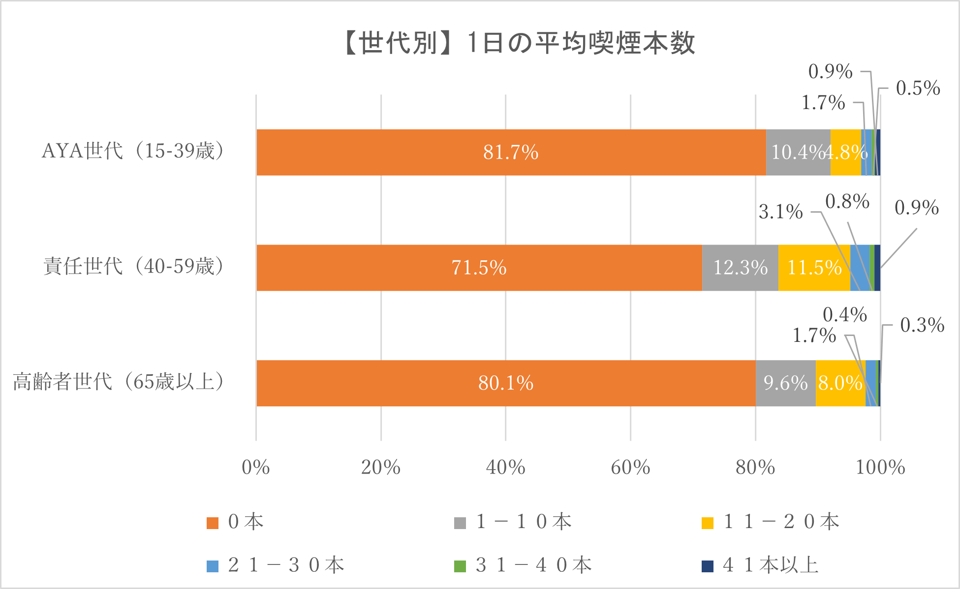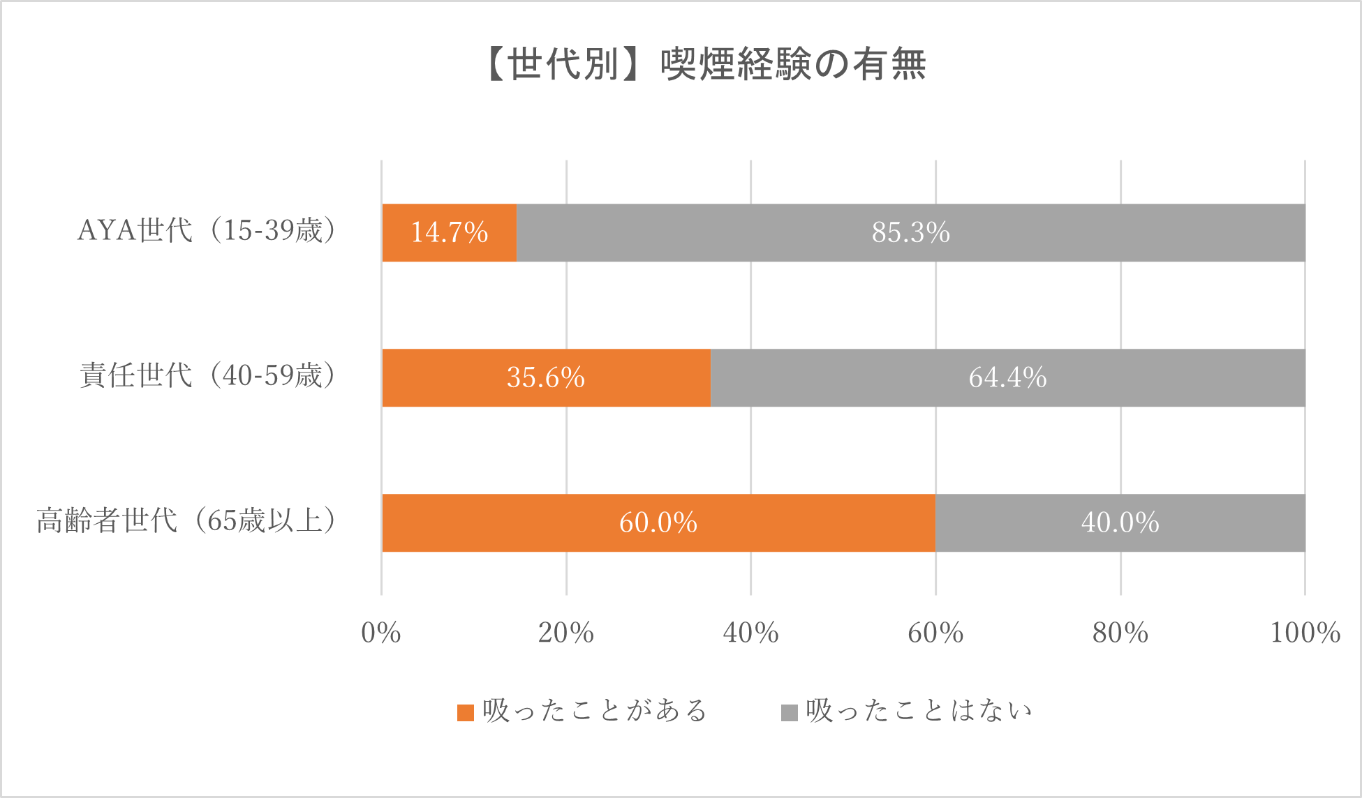 世代が上がるにつれて喫煙経験があると回答した割合が増加していることがわかります。対してAYA世代では、そもそも喫煙経験がない人が約85%を占めています。