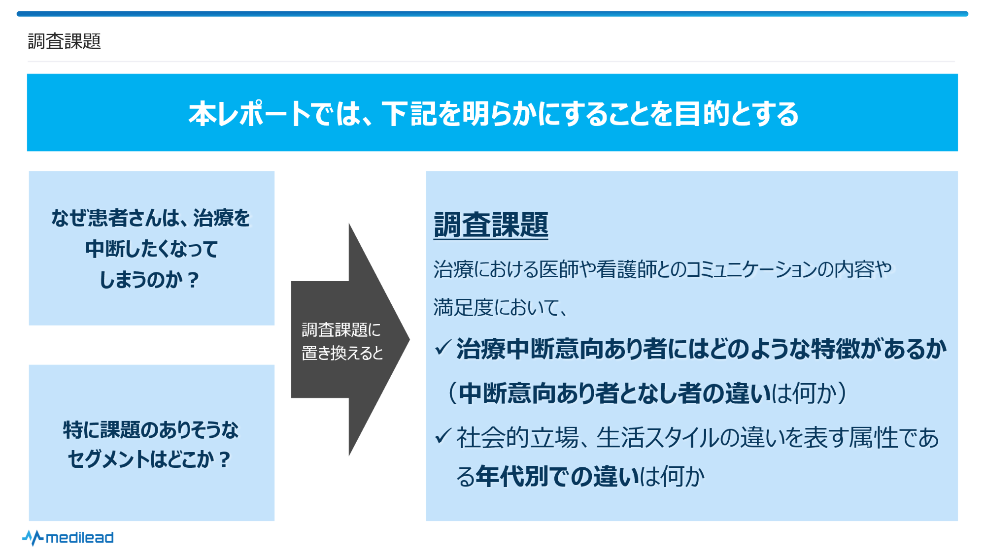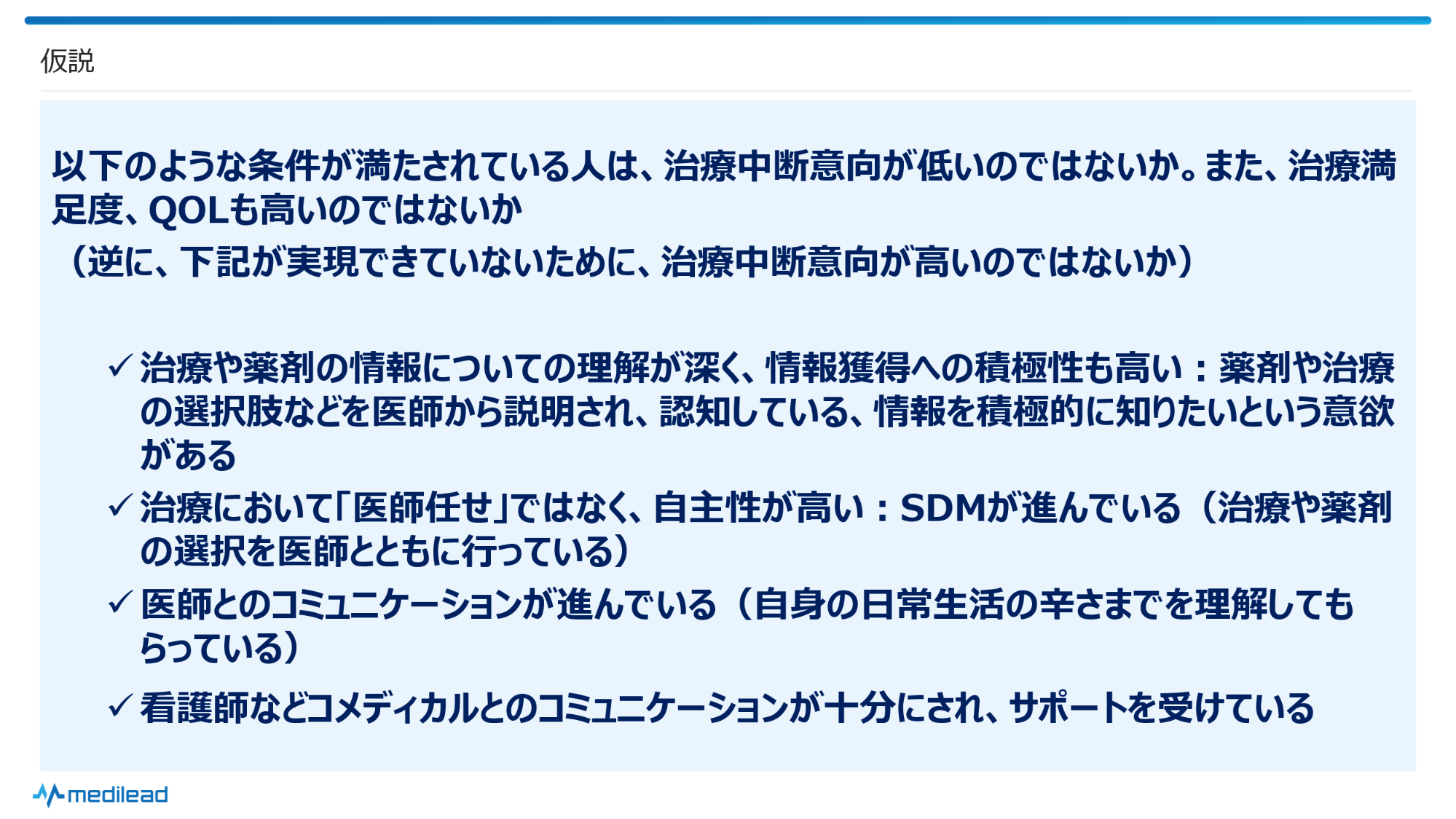 しかし実際のところ、医師やコメディカルといった医療従事者とのコミュニケーションやSDMの程度、それがどの程度患者さんの治療継続のモチベーションに関連しているのか、についてはまだ理解が進んでいない状況があります。