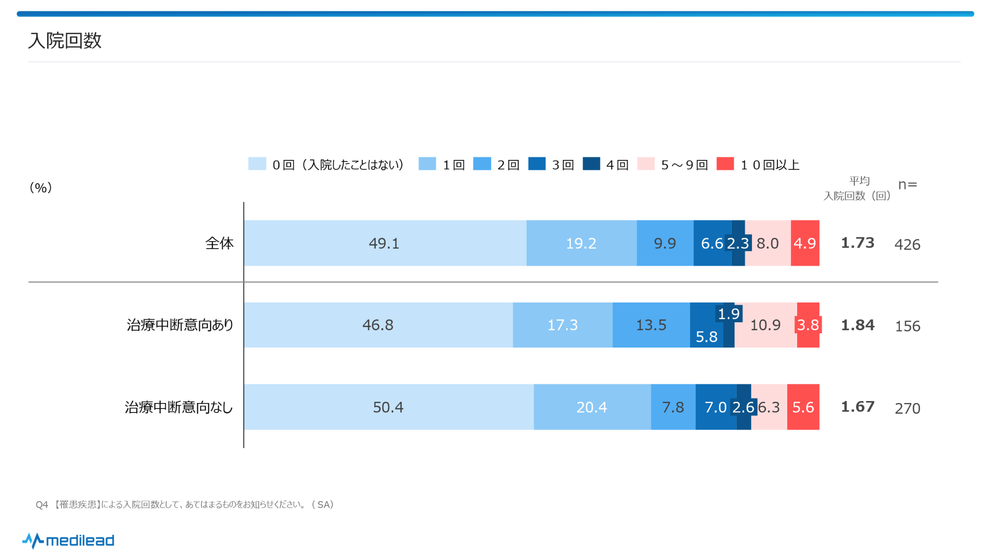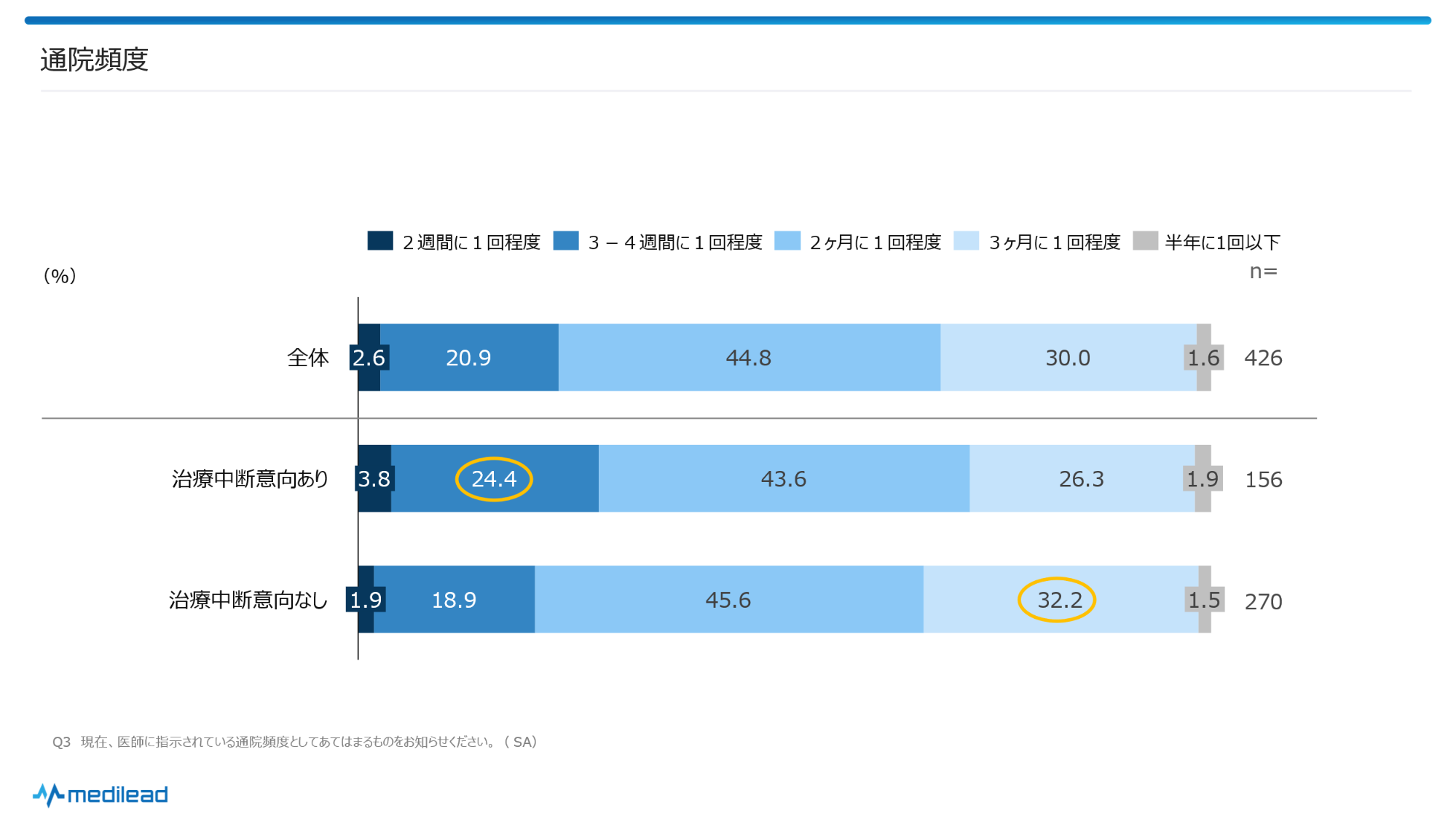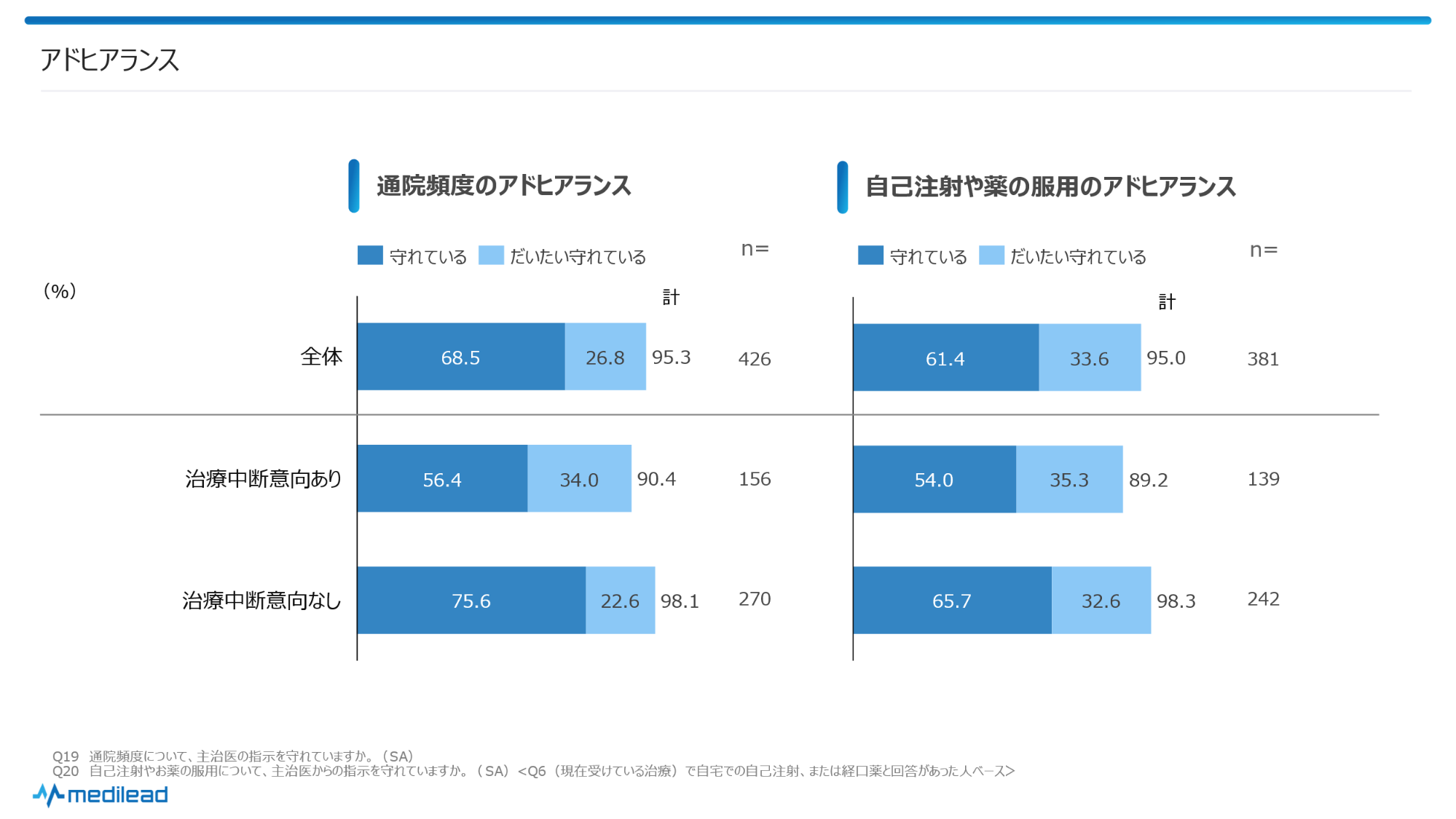 治療に際しての患者さんのアドヒアランス、つまり、通院頻度や服薬についてどのくらい医師の指示を守っているか、についてみてみます。