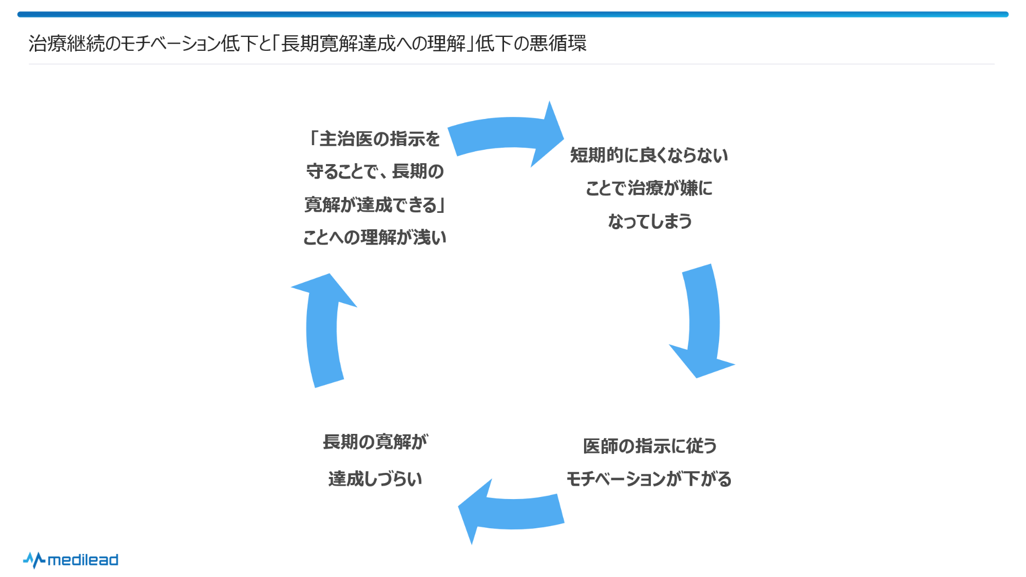 中断意向あり者がなし者に比べ、「主治医の指示を守る」ことに対しての重視度が低めなのか、「長期の寛解が達成できる」ことに関しての理解が浅いのかは定かではありません。しかし、中断意向あり者には以下のような悪循環が起こっている可能性があります。
