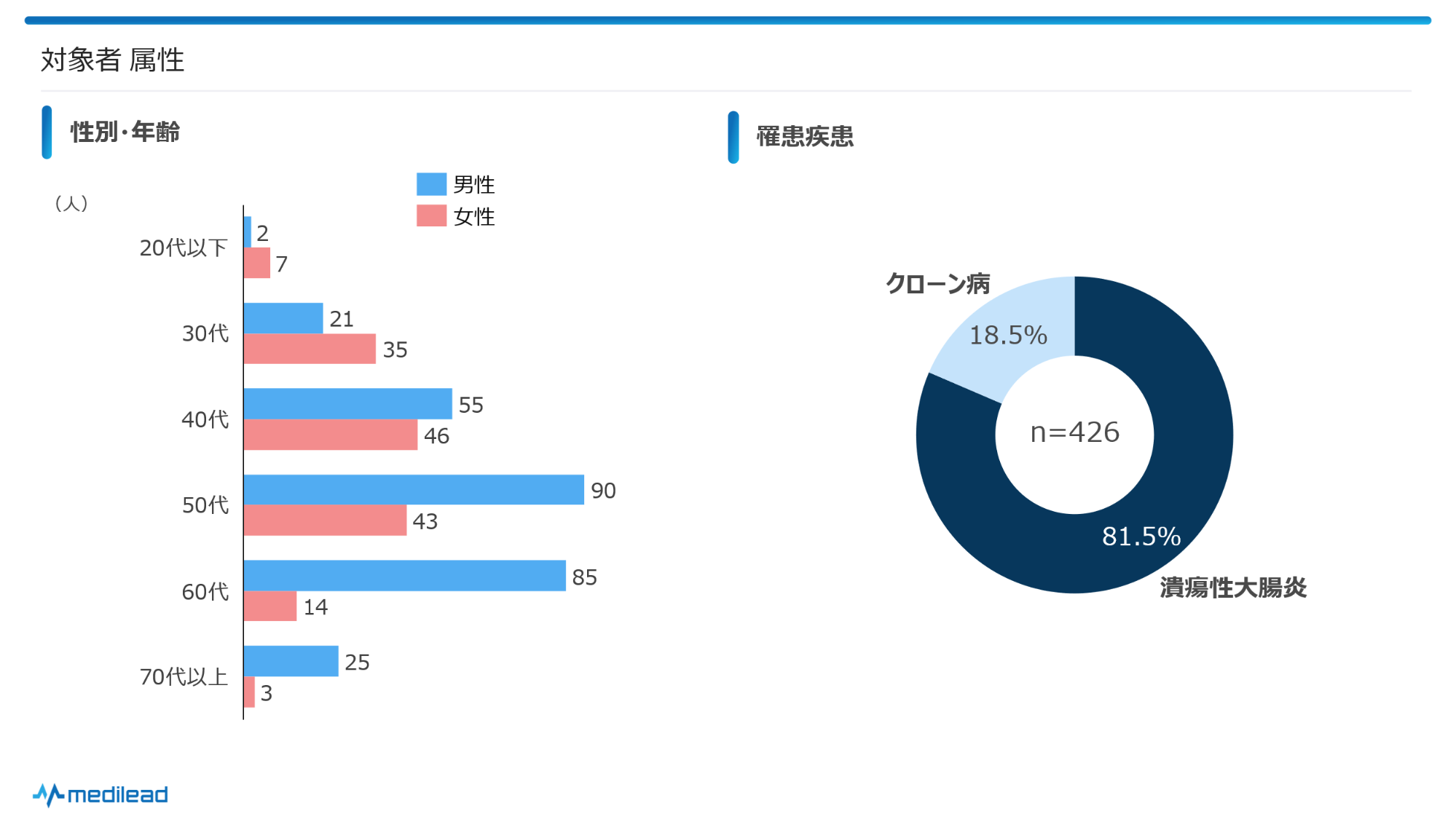 株式会社クロス・マーケティンググループ(本社:東京都新宿区、代表取締役社長兼CEO:五十嵐 幹、東証一部3675)のグループ会社である株式会社メディリード(本社:東京都新宿区 代表取締役 亀井 晋、以下「メディリード」)は、炎症性腸疾患(IBD)患者の治療の満足度及びその背景となる医療従事者とのコミュニケーションなどについての自主調査(2023年)を行い、426名からの回答を得ました。
