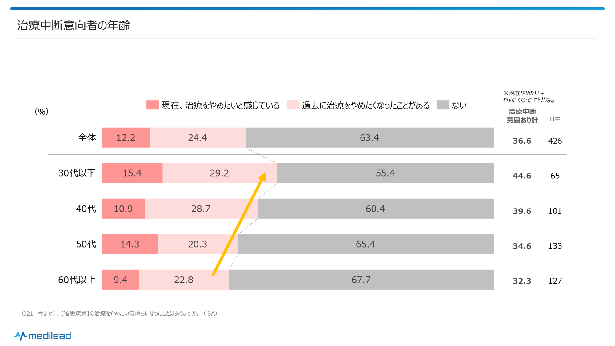 年齢をみてみると、中断意向あり者(「現在、治療をやめたいと感じている」人と「過去に治療をやめたくなったことがある」人の合計)は中断意向なし者と比較して年齢は若めでした。30代以下では半数近く(44.6%)が中断意向あり者となりました。