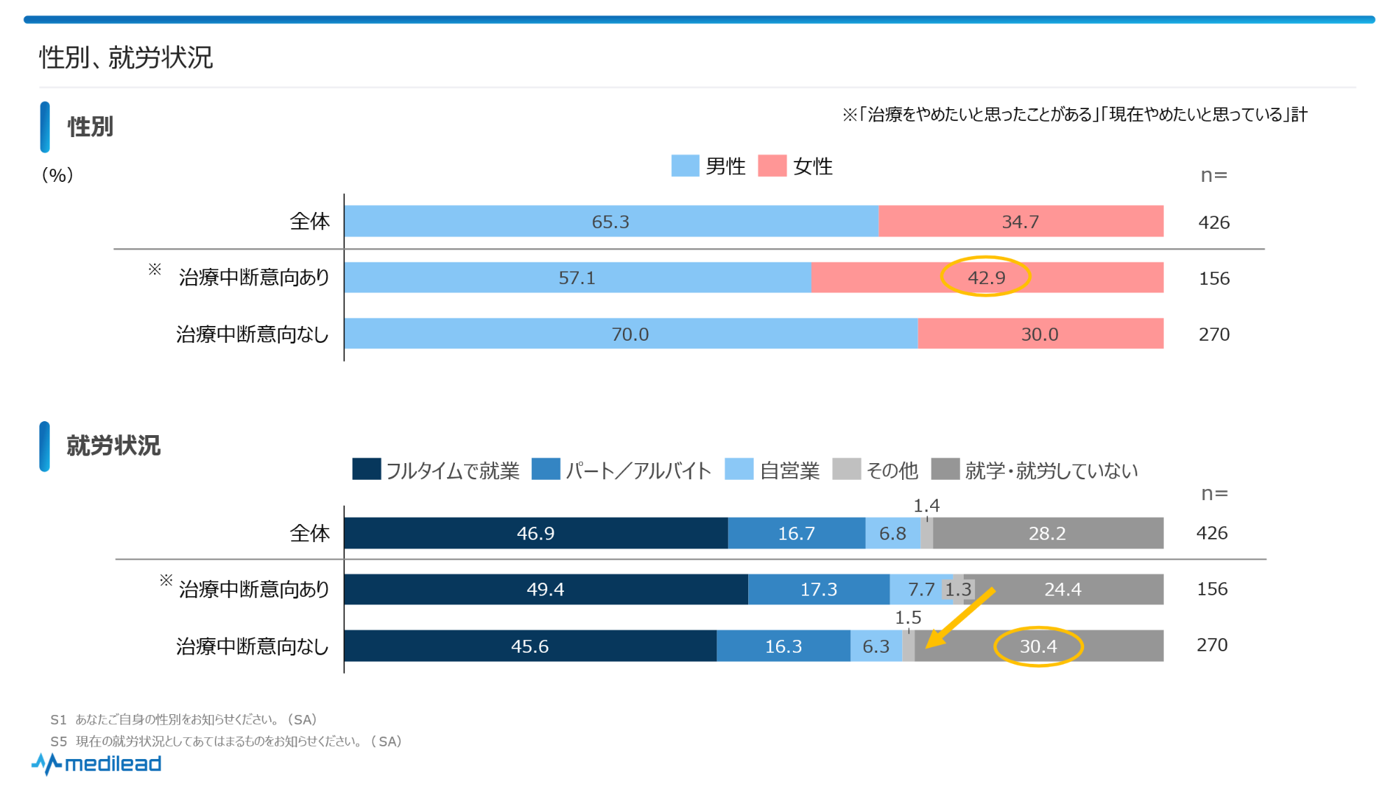 また、治療中断意向者は就学・就労者の割合が高かったことも特徴です。つまり、中断意向なし者に比べ学業や仕事との両立についての悩みが深いと思われます。