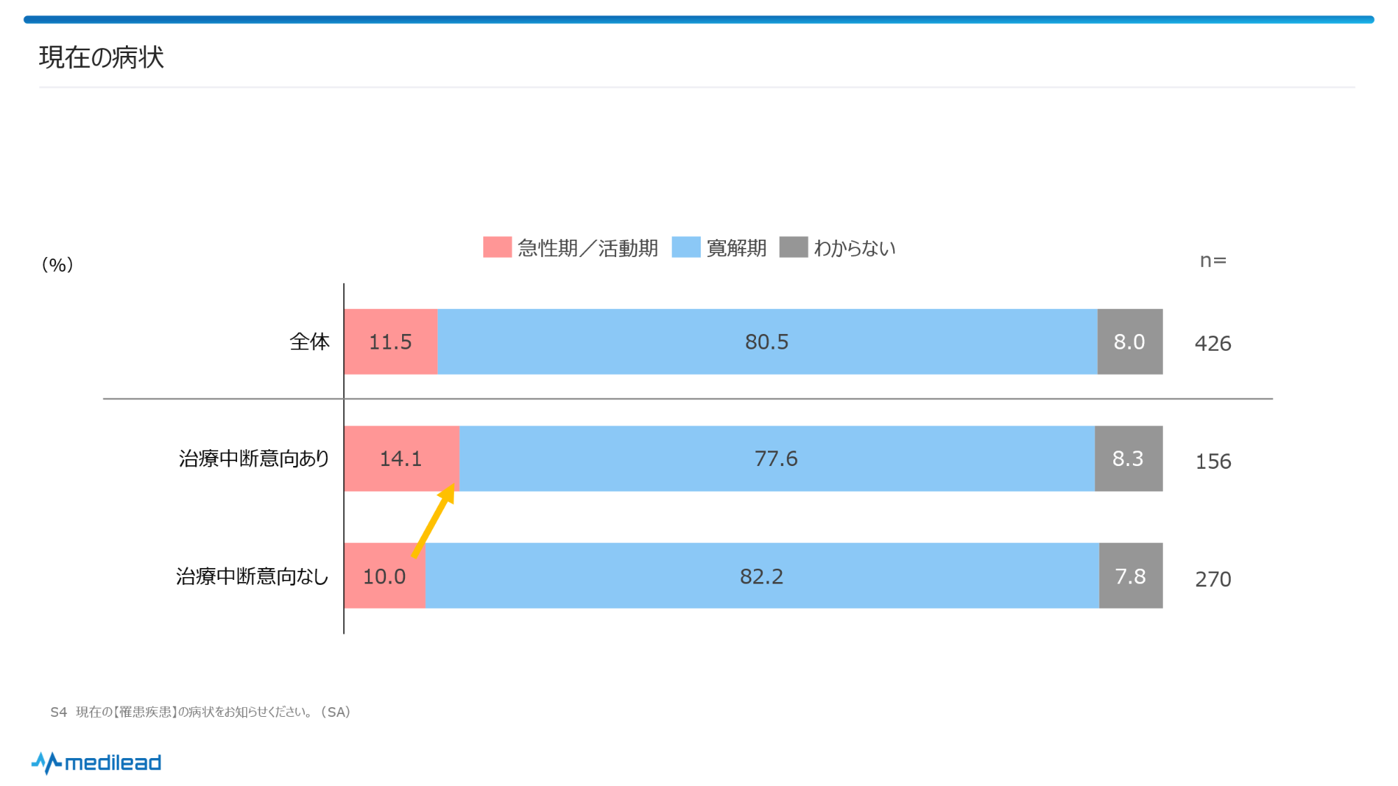 治療中断意向ありの患者さんは、なしの患者さんに比べて症状がやや重めであるにもかかわらず、「主治医の指示に従う」傾向がやや低いことがわかりました。背景には、「主治医の指示に従うこと」により「長期の寛解が達成できる」ということの理解があまり進んでいない、ということがありました。