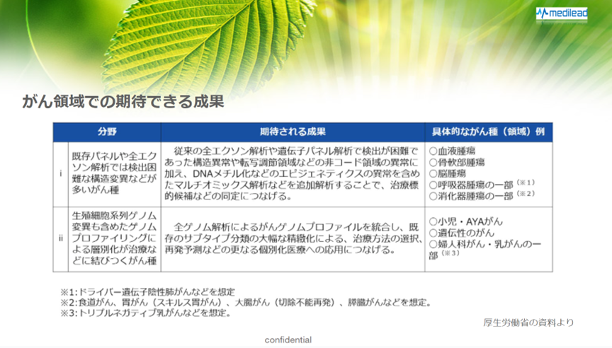 特にゲノム医療における効果が期待される分野は、がん領域です。たとえば、血液腫瘍、脳腫瘍、呼吸器腫瘍、消化器腫瘍など、既存のパネルや全エクソン解析(ゲノム中のタンパク質をコードするエクソン全体を対象とした遺伝子解析技術)では検出が困難な構造変異を多く含むがん種があります。さらに、小児・AYAがん、遺伝性がん、婦人科がん、トリプルネガティブ乳がんなど、ゲノムプロファイリングによる層別化が治療に結びつく可能性のあるがん種にも効果が期待されます。このような分野での個別化医療の応用が推進されることにより、より早期に新しい薬剤を患者さんに届けることが可能になるでしょう。