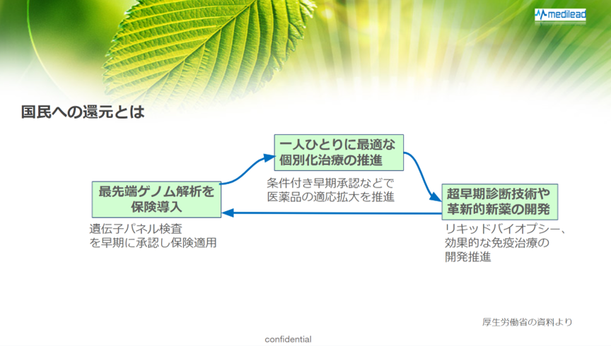 そして三つ目は「超早期診断技術や革新的新薬の開発」の支援です。リキッドバイオプシーを含む新たな診断法や免疫治療の開発に政府が支援を行い、ゲノム医療の進展を促します。