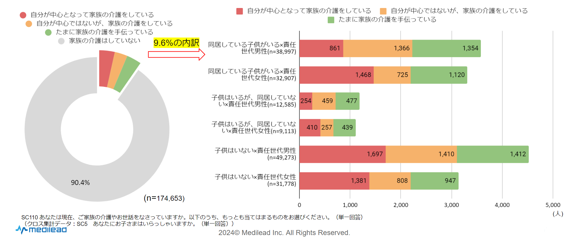 | ・ | 責任世代で、ご家族の介護をしている・手伝っている方の割合は約10%であった。子育てと介護を同時に担う「ダブルケア」をしている責任世代の方は全体の約4%(6,894人)と、より多くの役割を持つ方もいることがうかがえる〈図3〉 |