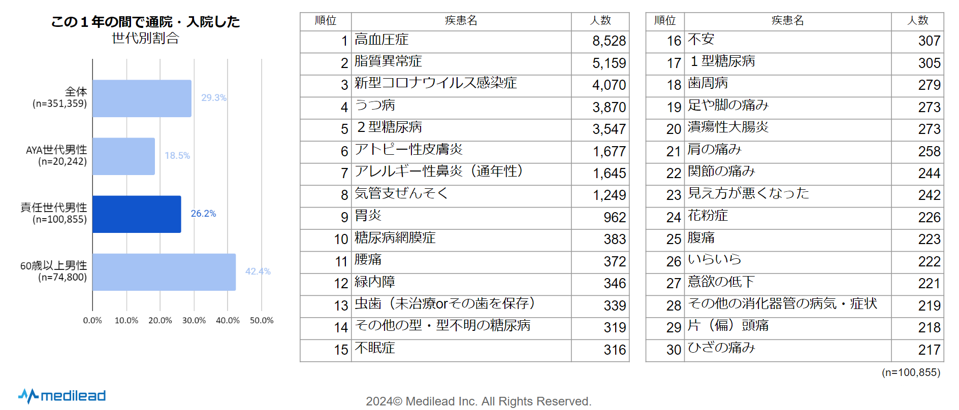 MHPは2018年から年1回実施している大規模調査です。毎年30万~35万人ほどの回答を得られており、直近1年以内に入通院歴がある約5万人と、同期間に入通院歴がない約30万人、介護をしている約1万人で構成されております。